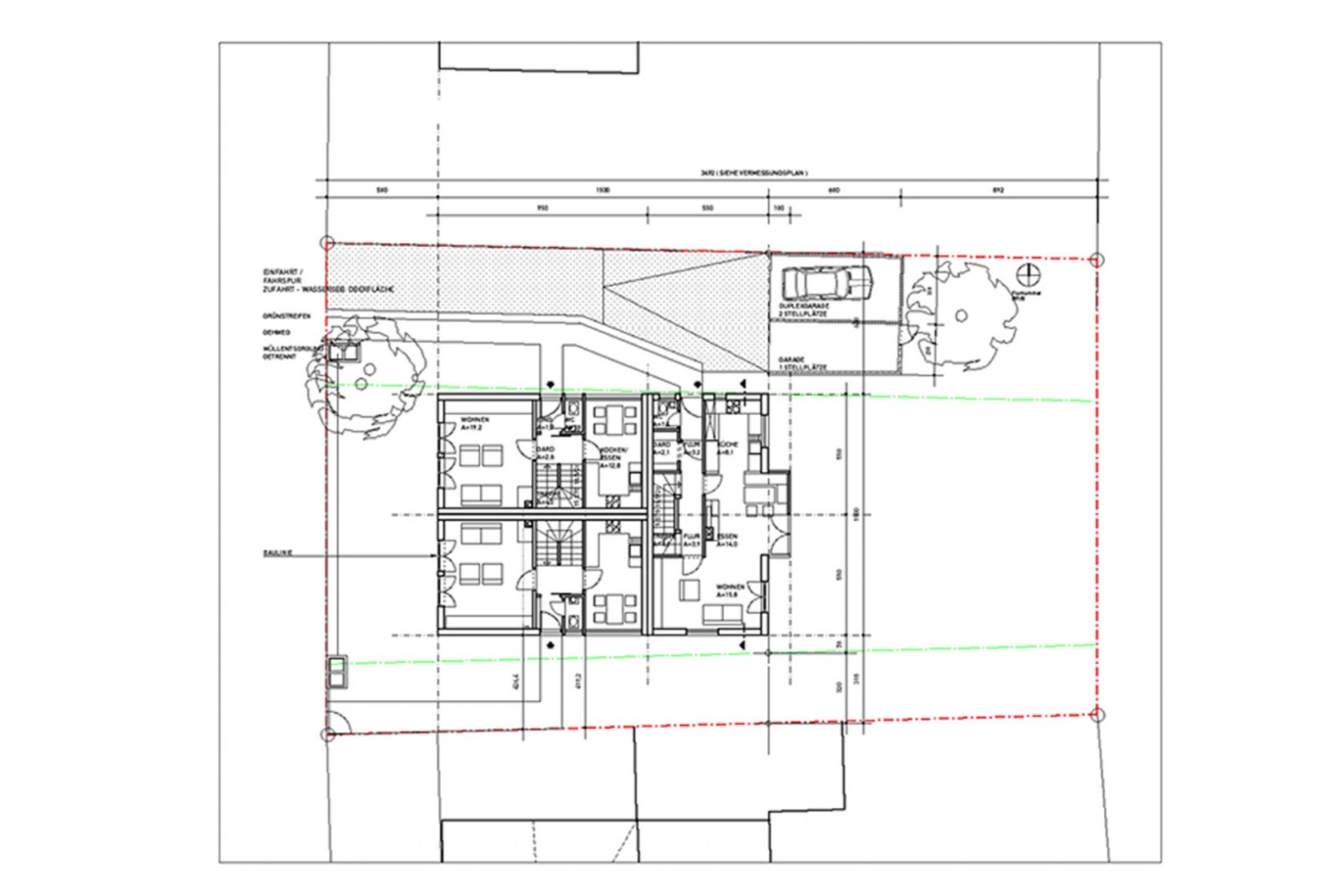 Haus für drei Familien mit dazugehörigen Freiflächen nach den Regeln der Gartenstadtsatzung