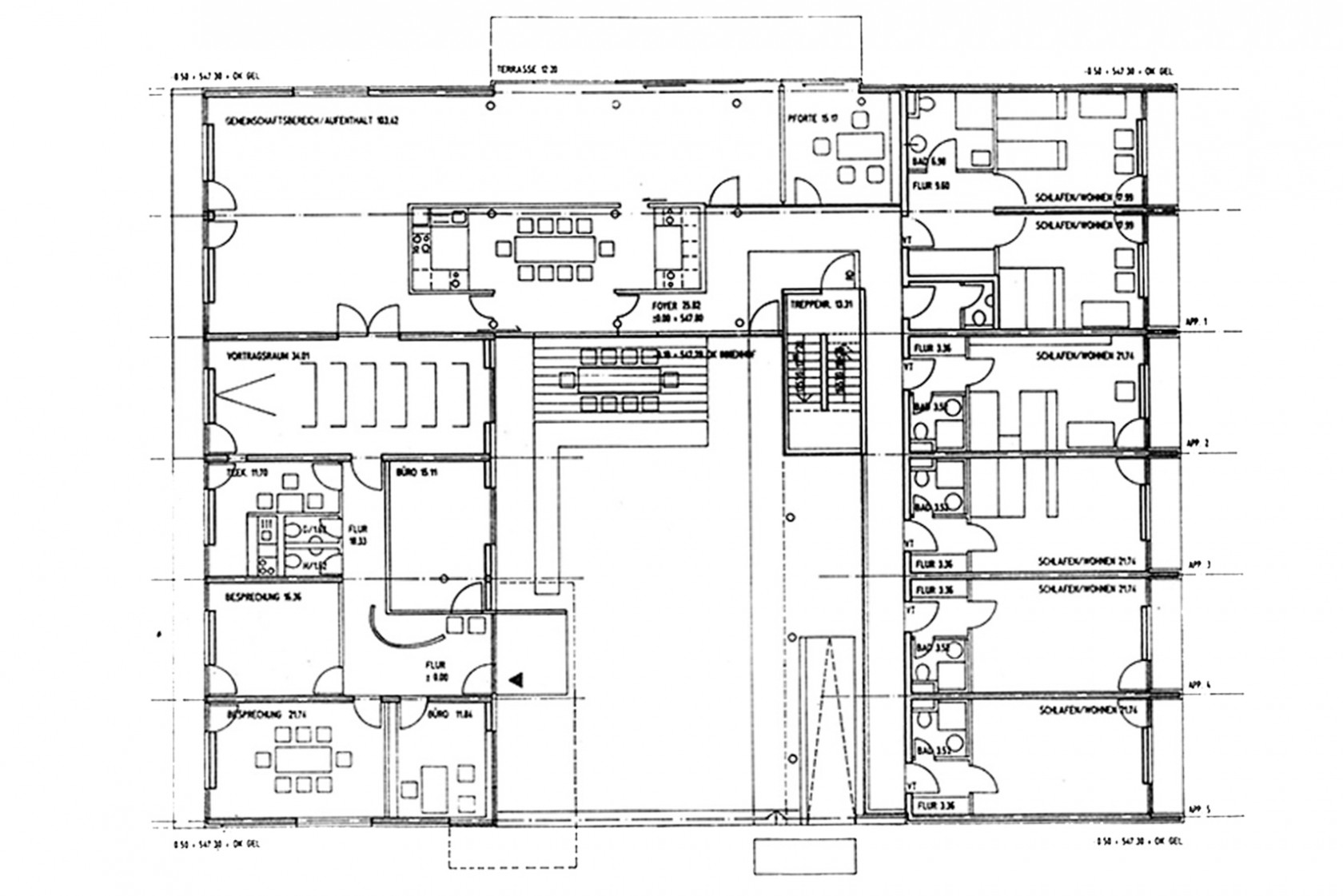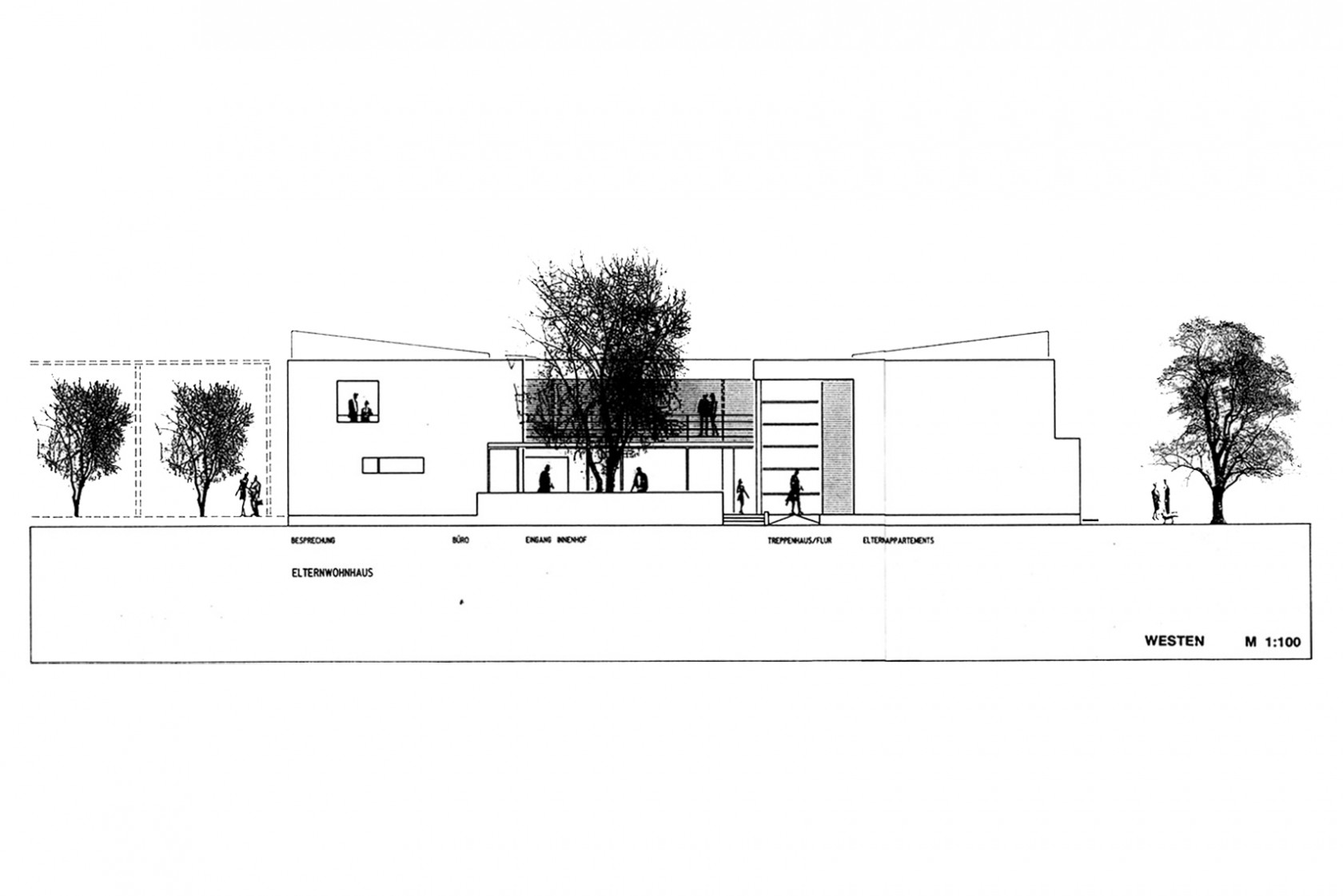 Unterbringung und Betreuung von Eltern schwerkranker Kinder auf dem Gelände des Klinikum Großhadern. Die hierarchische Anlage und Form des Gebäudes tragen dem Schutz und dem Bedürfnis nach Geborgenheit der Menschen in einer besonders kritischen Situation Rechnung