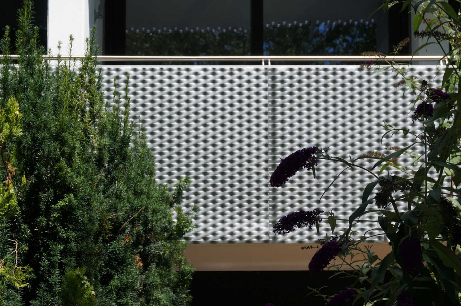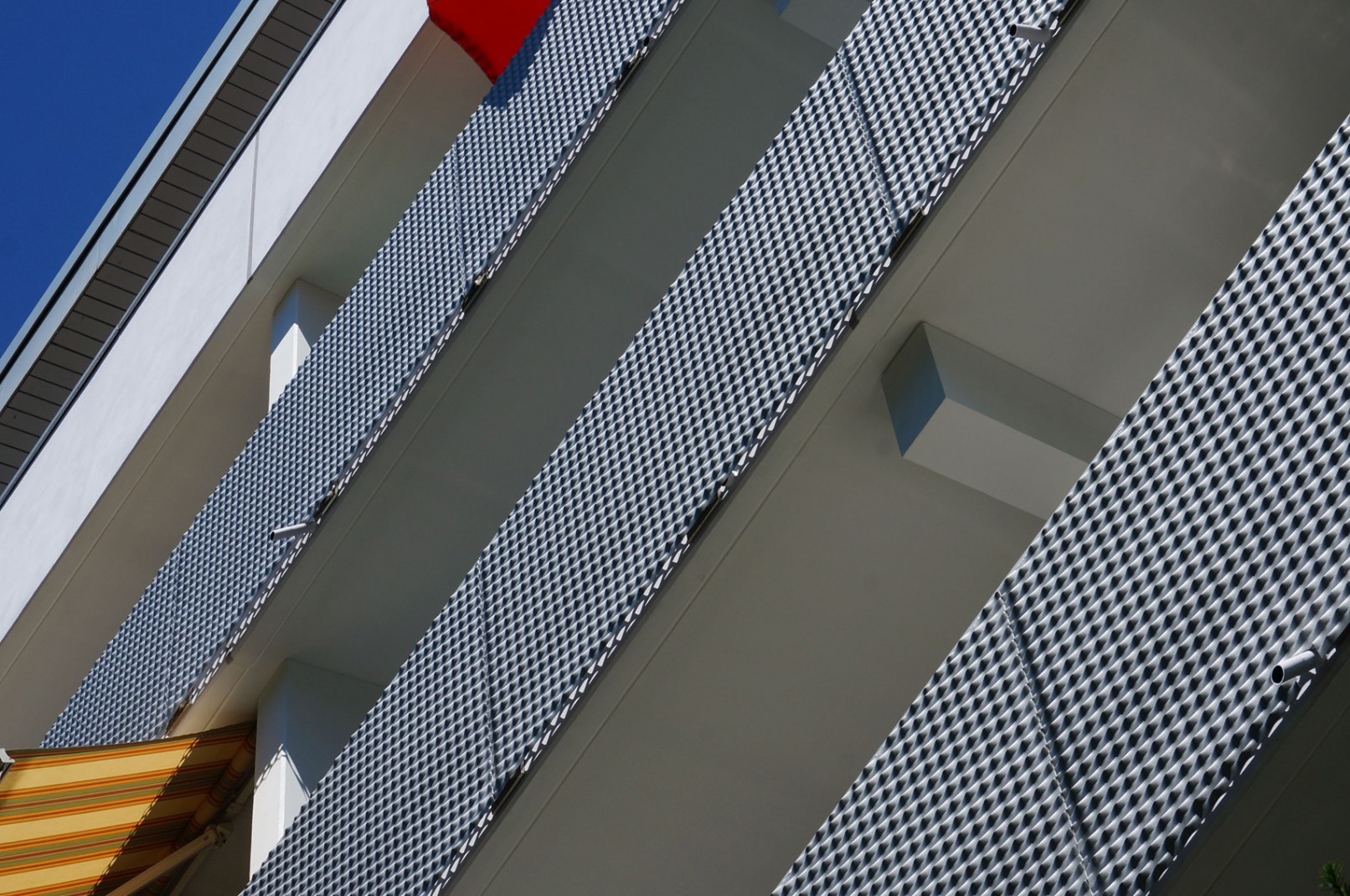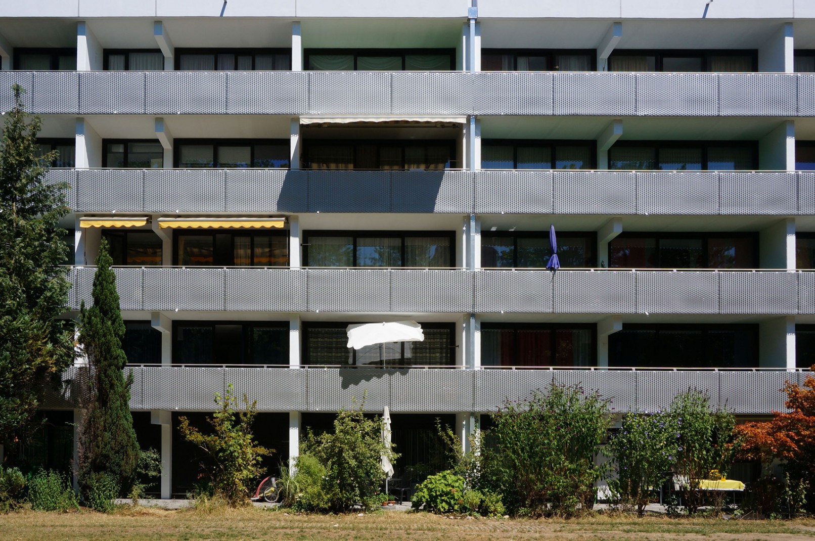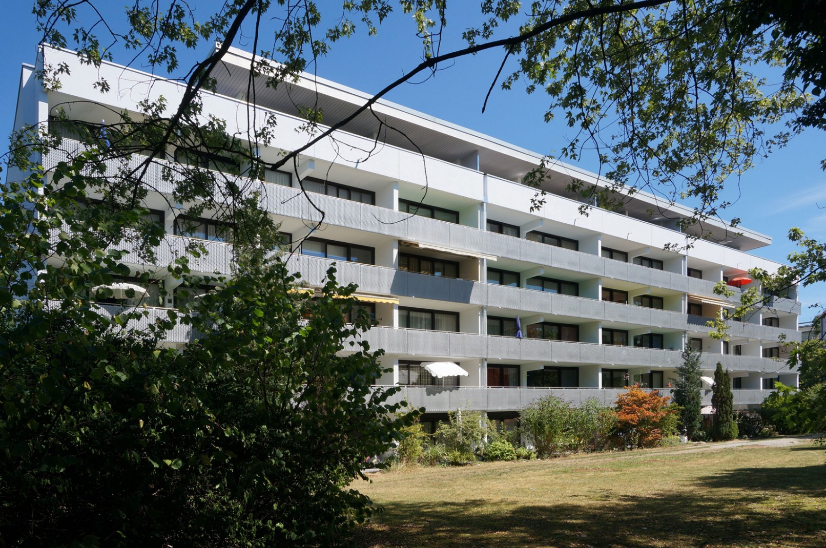 Runderneuerung eines Wohnblock aus den 70er Jahren. Farbliche Gestaltung der Nordseite um die Rasterung der Fenster lebendig einzugliedern. Erneuerung der Brüstungen an der Südseite mit Streckmetallelementen.