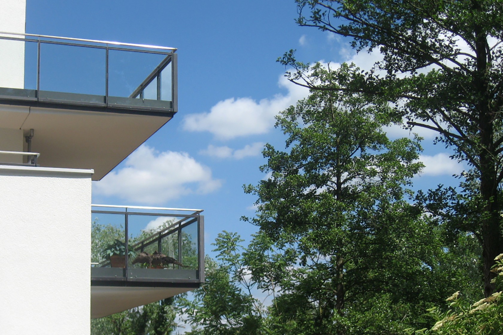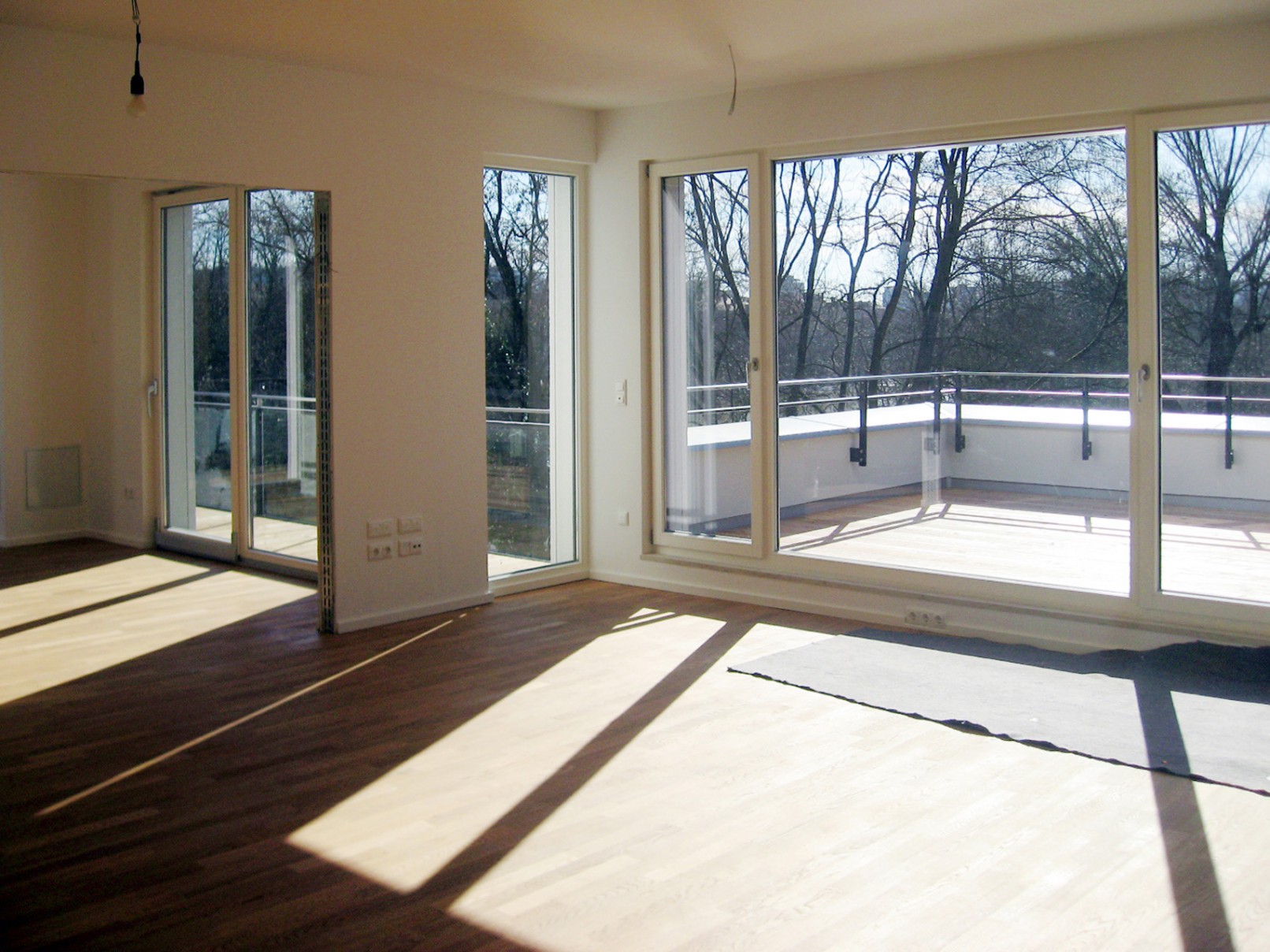 Entsprechend der Ausrichtung sind die Fassaden nach Westen schützend geschlossen und nach Osten mit großzügigen Balkonen, Terrassen und Fenstern weit geöffnet. Das Untergeschoss liegt in der Hochwasserzone – hier befinden sich die Stellplätze, die im Überflutungsfall leicht zu räumen sind.