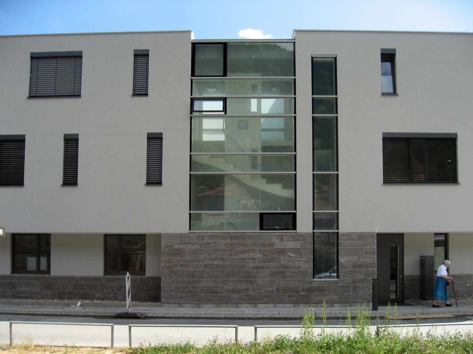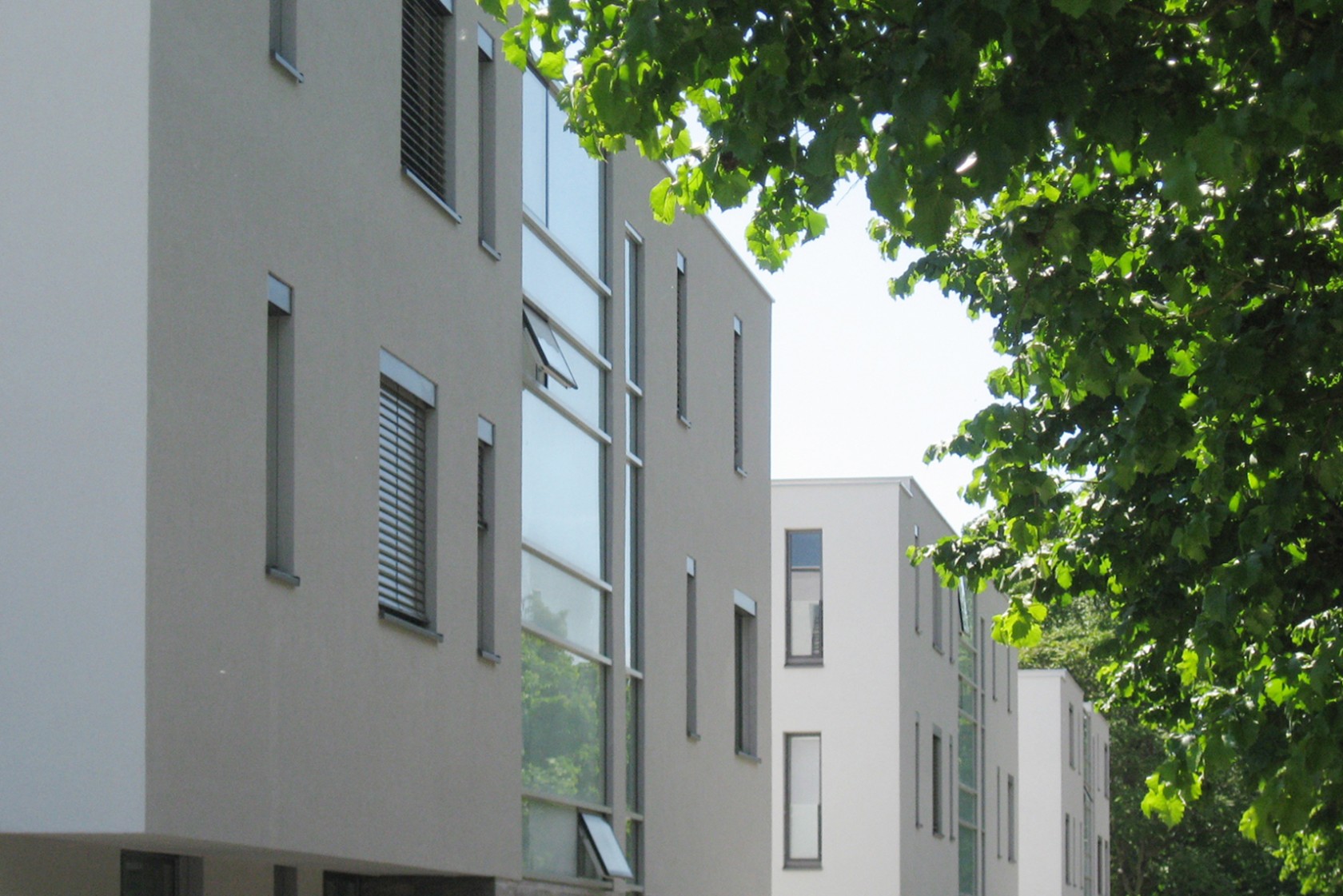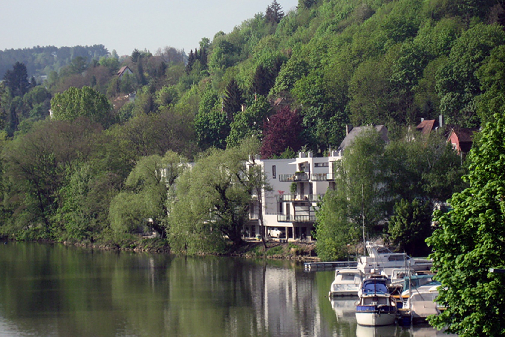 Auf einem Ufergrundstück zwischen einem Seitenarm des Mains und einer Einfallstraße in die Innenstadt befand sich ein vor vielen Jahren aufgegebenes Schwimmbad. Die Stadt Würzburg schrieb zur Neubebauung 2004 einen Investorenwettbewerb mit der Anforderung nach Transparenz zum Main aber ohne festge- legte Nutzung aus. Die Kombination des Angebotes der `Projekt Wohnen am Main GmbH‘ mit unserem Entwurf für hochwertigen Wohnungsbau konnte das Verfahren gewinnen.