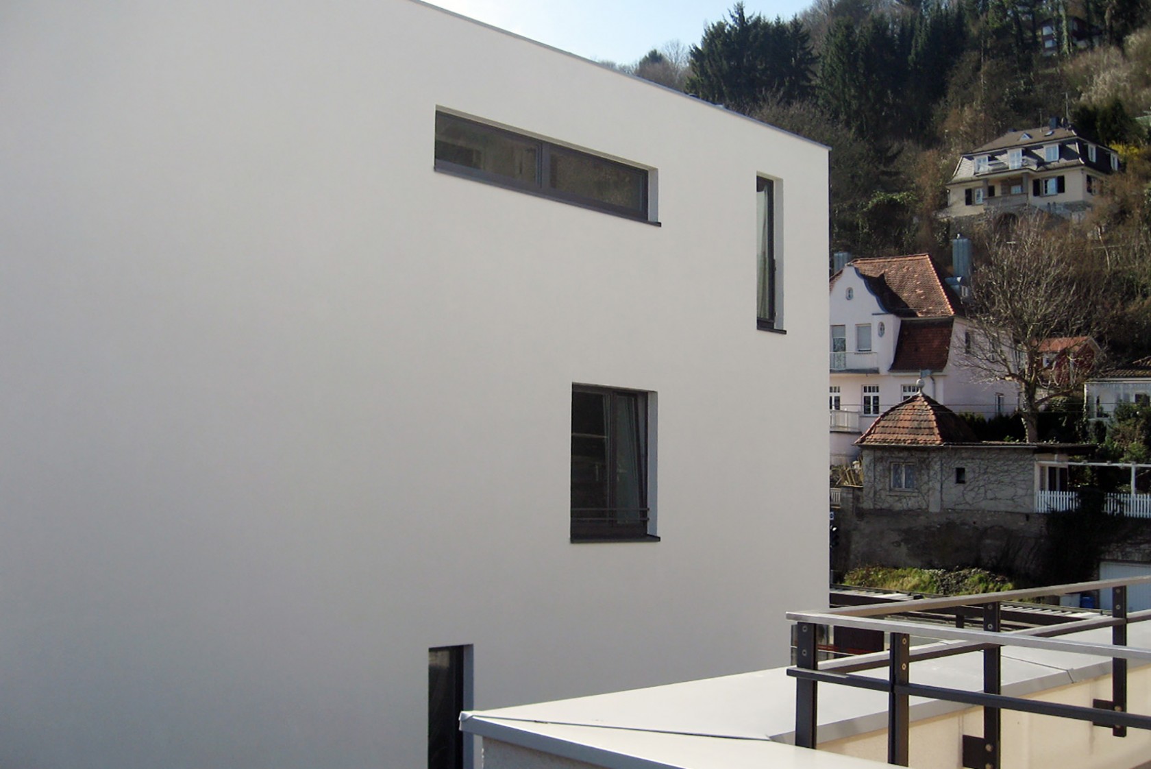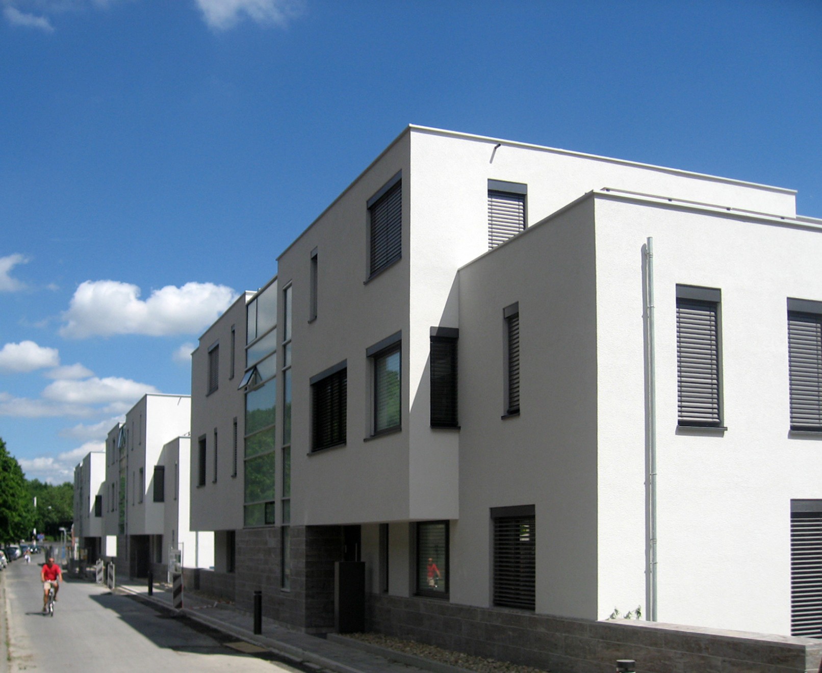 So wurde das Projekt mit drei Einheiten und je sieben Wohnungen auf drei Ebenen durchgeplant und realisiert. Charakteristisch ist die starke Ambivalenz der Ausrichtung zum einen nach Osten auf das Biotop des Mains und zum anderen nach Westen zur stark befahrenen Mergentheimerstraße, die eine hervorragende Anbindung zur Stadt und zur Autobahn darstellt. Nach Norden sind die Altstadt und die Festung von Würzburg zum Greifen nahe.
