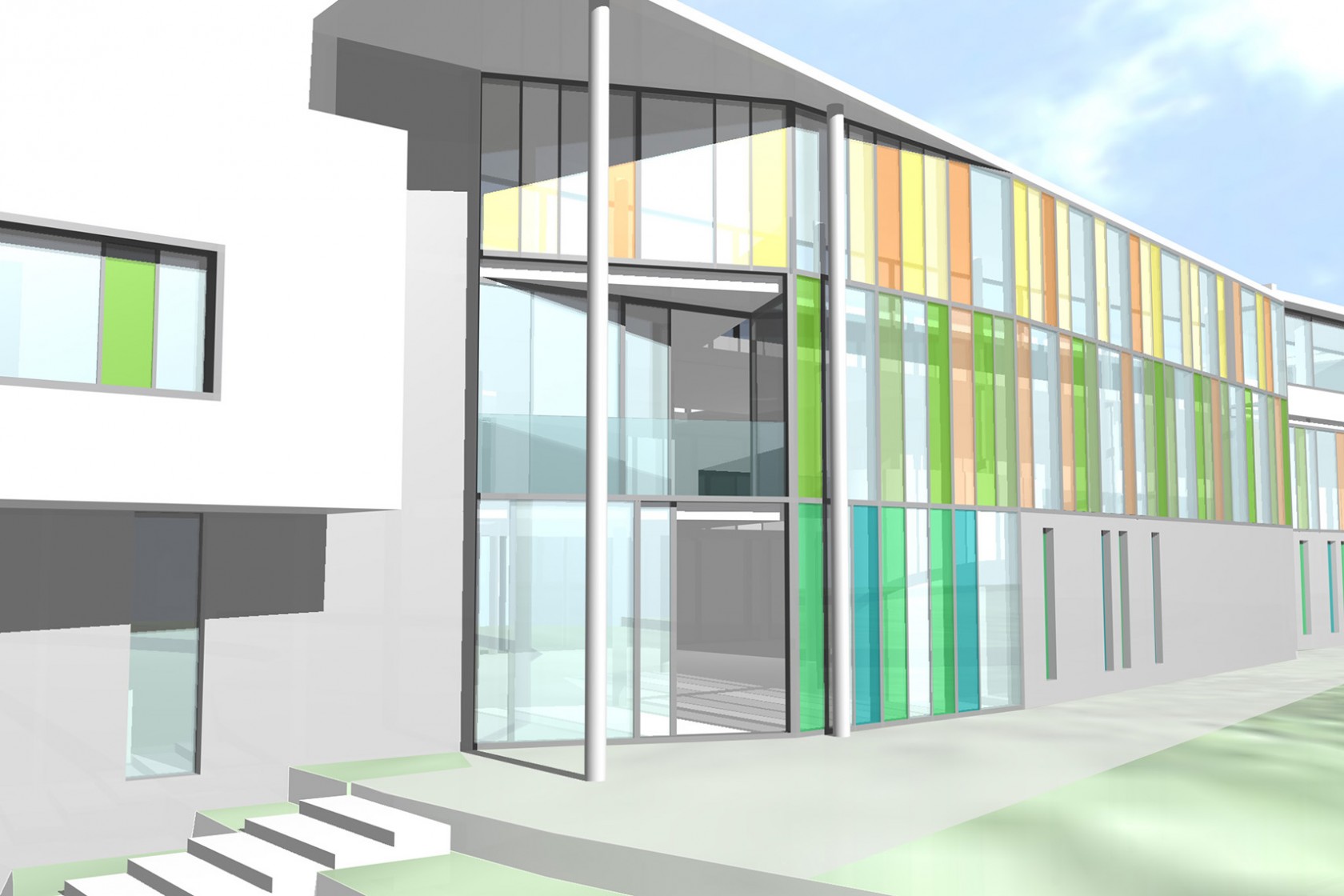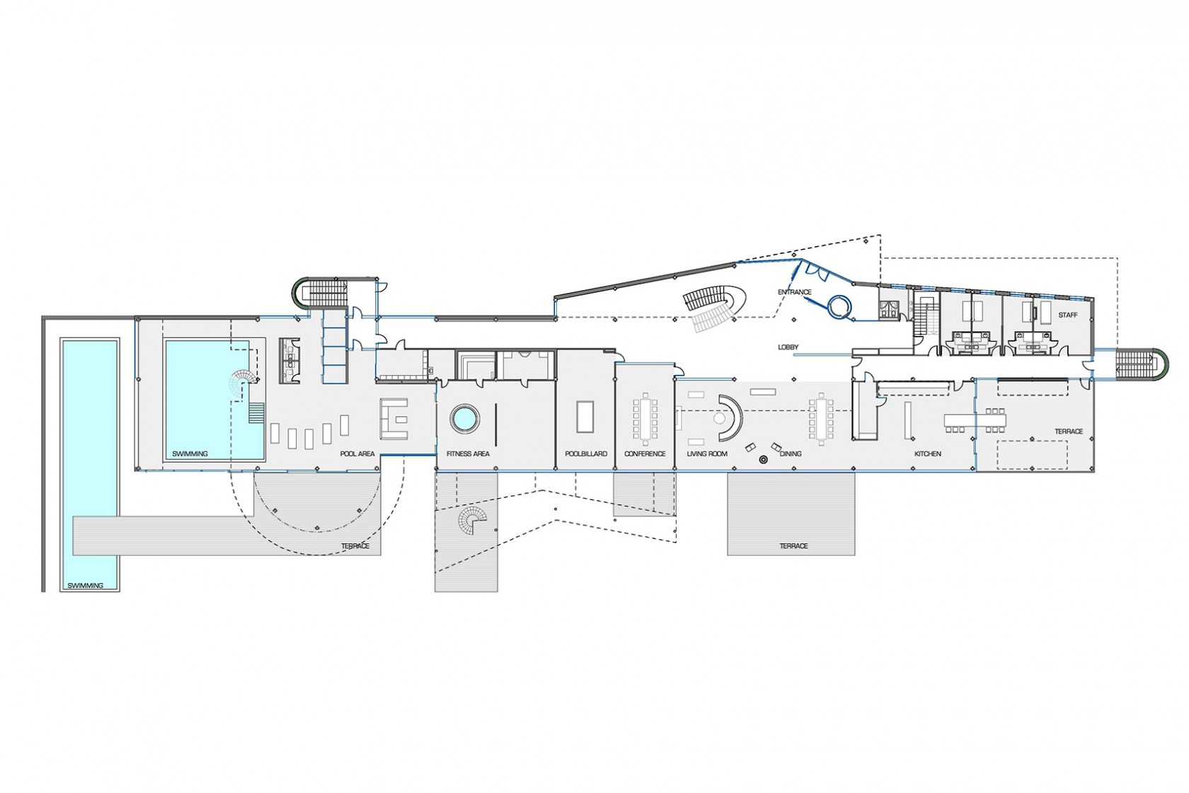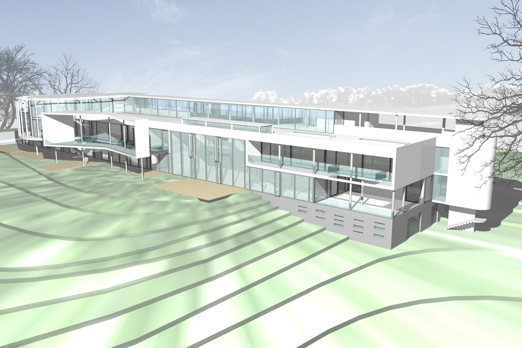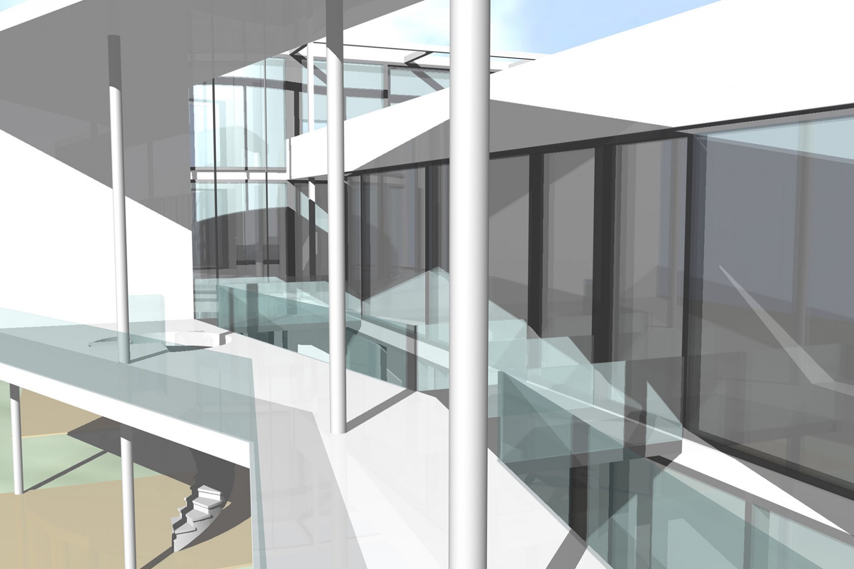 Der Baukörper fügt sich mit seiner modernen Formensprache in die Landschaft ein. Er öffnet sich zur Natur und grenzt sich deutlich vom Nachbarn ab. Durch die Integration von Wasser- flächen und farbigem Glas wird der Villa ein ausdrucksstarkes, repräsen- tatives Erscheinungsbild mit hoher Aufenthaltsqualität verliehen.
