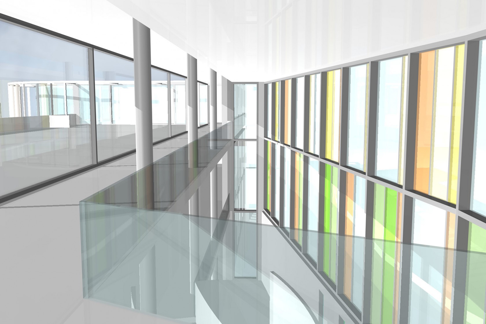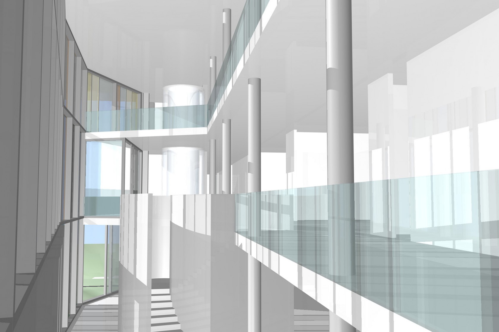 Optimale Belichtung des tiefen Grundrisses, Anbindung an das Bettenhaus im angeho- benen EG, Technik im Untergeschoss