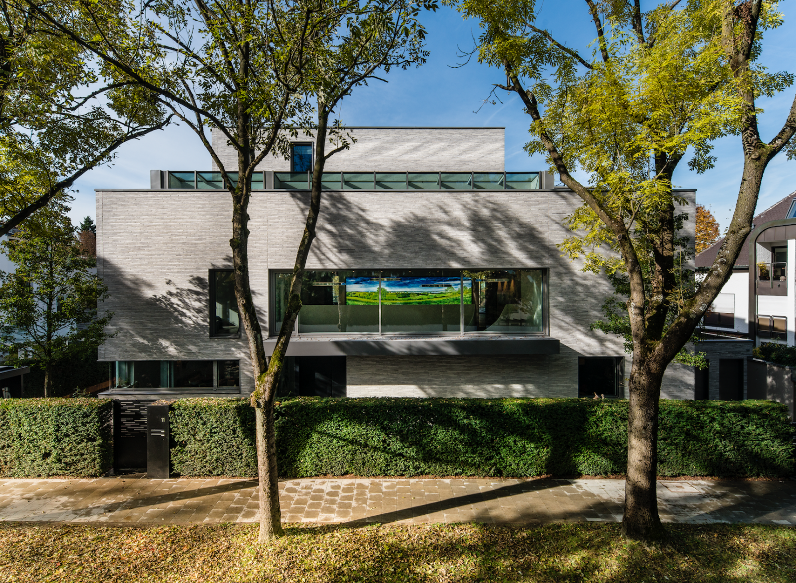 Zur Strassenseite zeigt sich das Gebäude durch grossflächig gegliederte Ziegelflächen geschlossen und dominiert durch eine grossformatige Öffnung im Obergeschoss. Über die Seitenfassaden mit Fenstern der Privaträume öffnet sich das Gebäude dann vollständig in den Garten nach Westen. Das prägende Material Ziegel als Struktur der Oberfläche, zusammen mit der Plastizität und den Öffnungen sowie den Grünanlagen ergeben eine ruhige aber doch spannenden Gesamtkomposition.