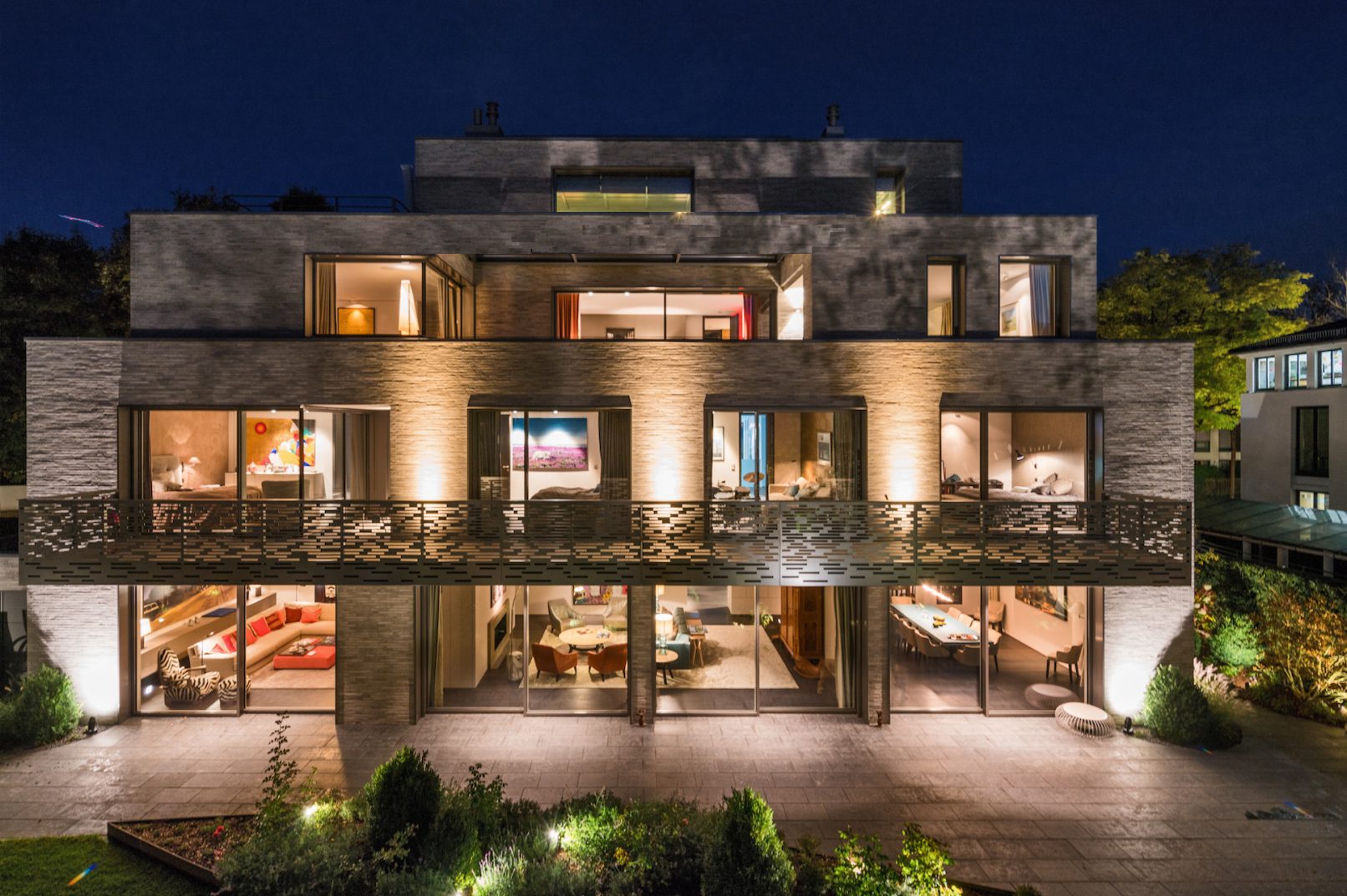 Das anspruchsvolle Gebäude ist neuer Familiensitz mit komplexem Programm für Gemeinschafts- und Individualräume für alle Familienmitglieder, Büros, Repräsentation, Regeneration und Freizeit sowie Garage für den umfangreichen Fahrzeugbestand in historisch bebautem Areal.