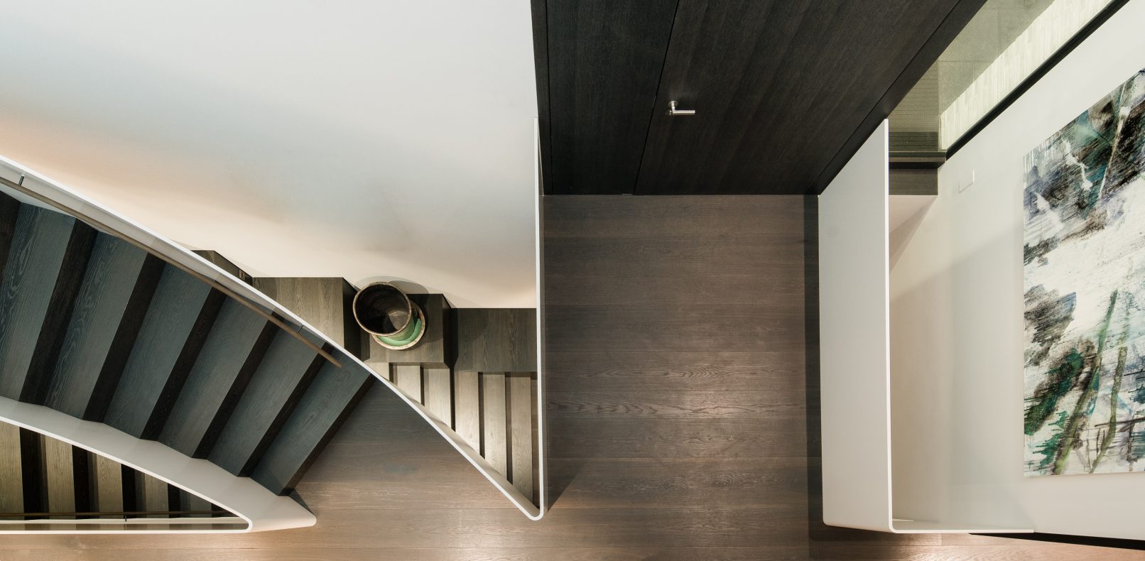 Die relativ geringen Stockwerkshöhen werden kompensiert durch die 3-geschossige Eingangshalle die der Besucher auf der mittleren Ebene über eine Brücke betritt. Dieser vertikale Raum führt in der ganzen Breite über eine grosszügige Treppe nach unten zu Wellness, Spa und Fahrzeughalle. Über dieser Treppe schwebt die geschlossene, geschwungenen Stahlskulptur der Treppe in die oberen Ebenen.