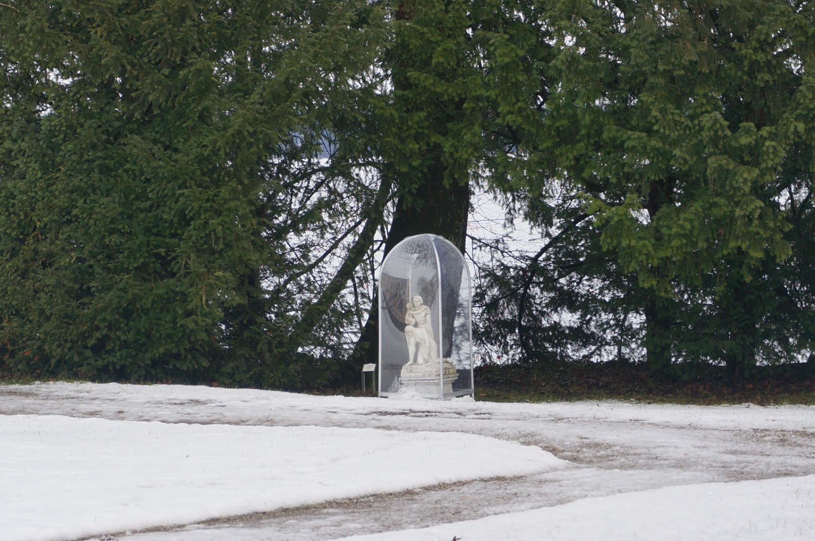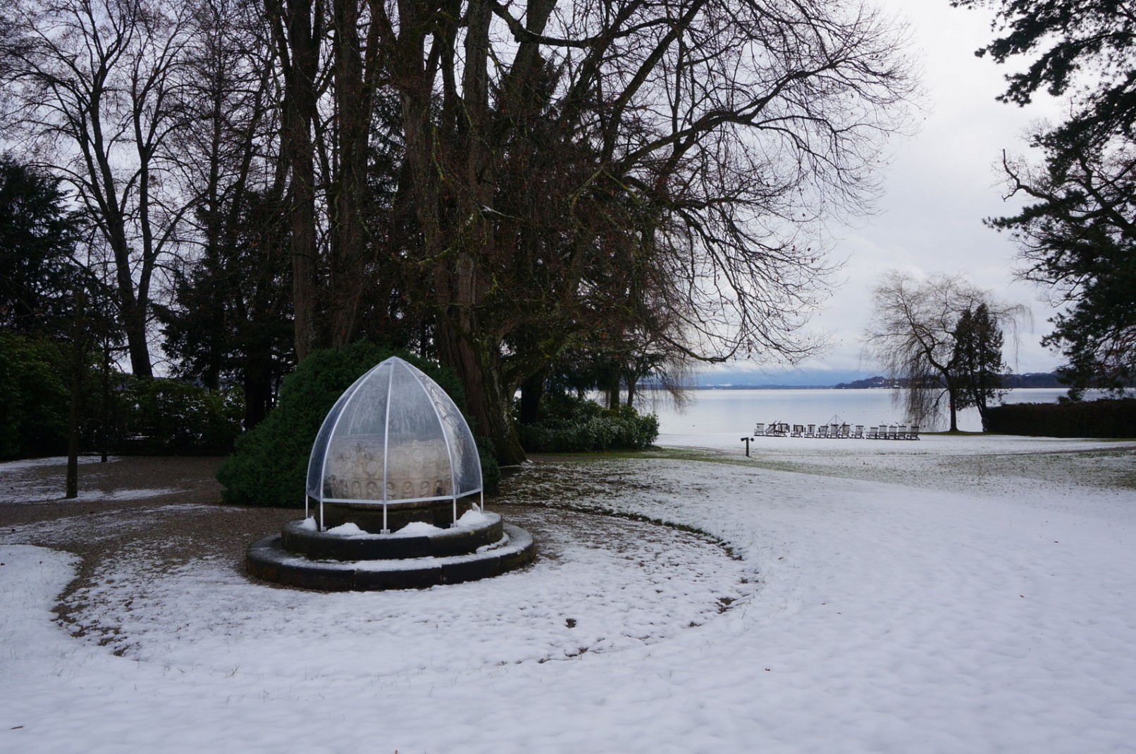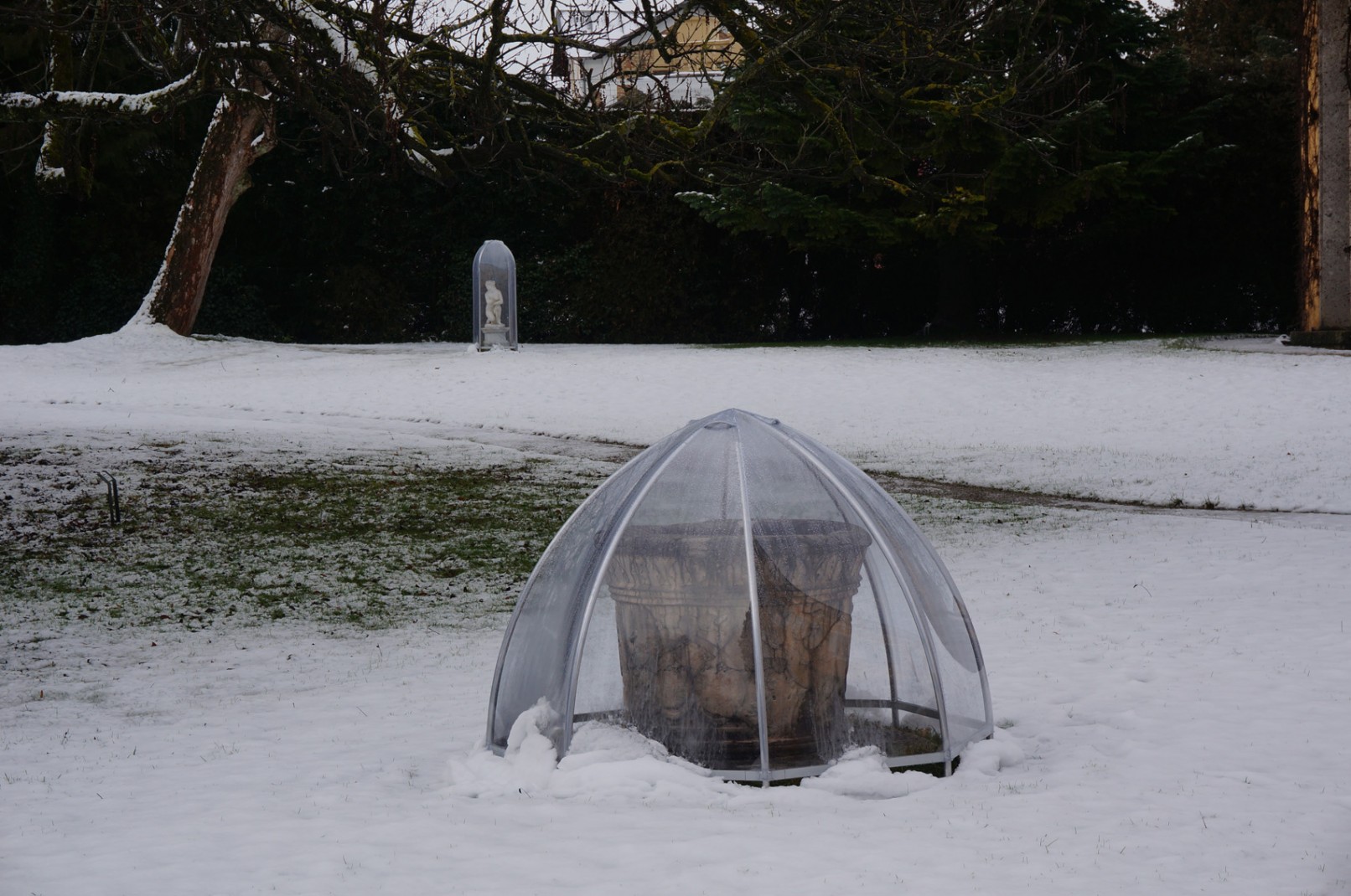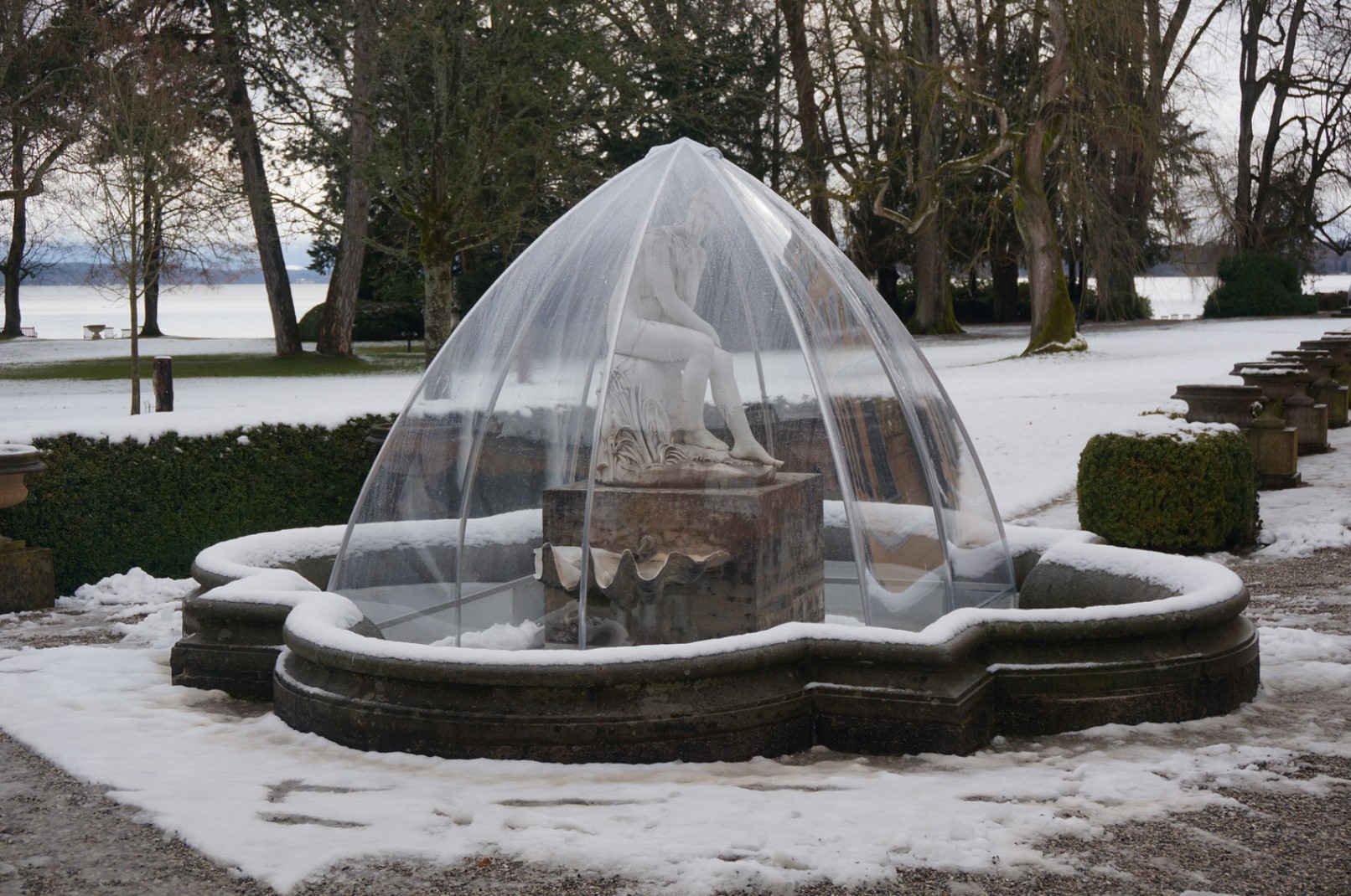 Winterschutz der Skulpturen und Brunnen im Park der Evangelischen Akademie Tutzing. Durch die transparenten Hüllen werden die Objekte nicht nur geschützt sondern auch optisch in der Winterlandschaft überhöht